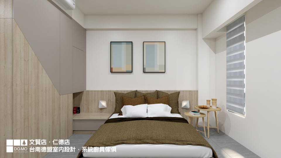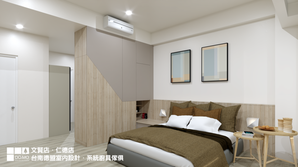 主臥室中,設計師考量到業主需求隱私性,在門口做了一面有假牆效果的收納櫃,並延伸至床頭為床邊櫃,巧妙地為臥床區隔出了一片更具隱密性的區域。