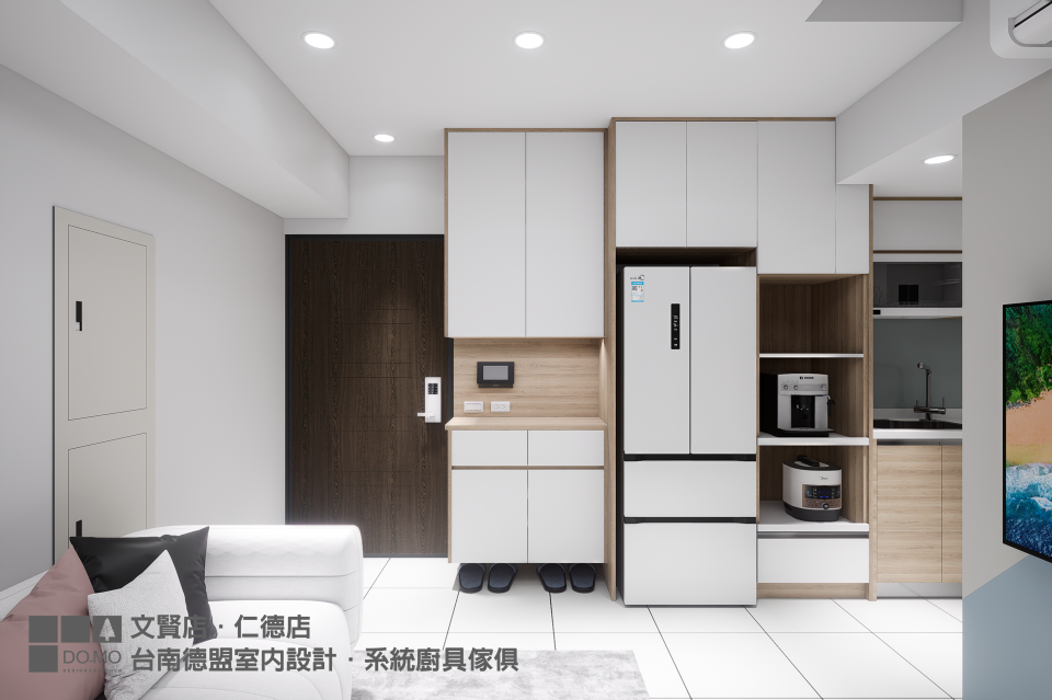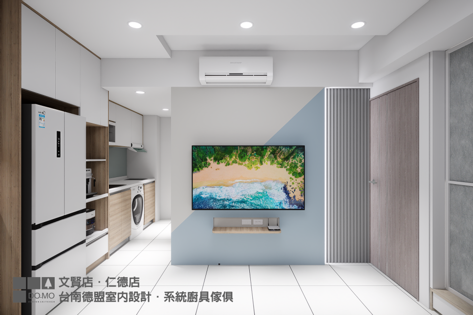 公領域的部分,從開放式廚房向外延伸增設一組電器櫃,解決原先的收納不足問題,玄關半開放櫃供業主隨手置放雜物及鞋櫃功能。此次案子皆已實用、功能性為主,僅在電視牆做油漆跳色妝點,簡單的幾何線條分割便為空間注入美感。