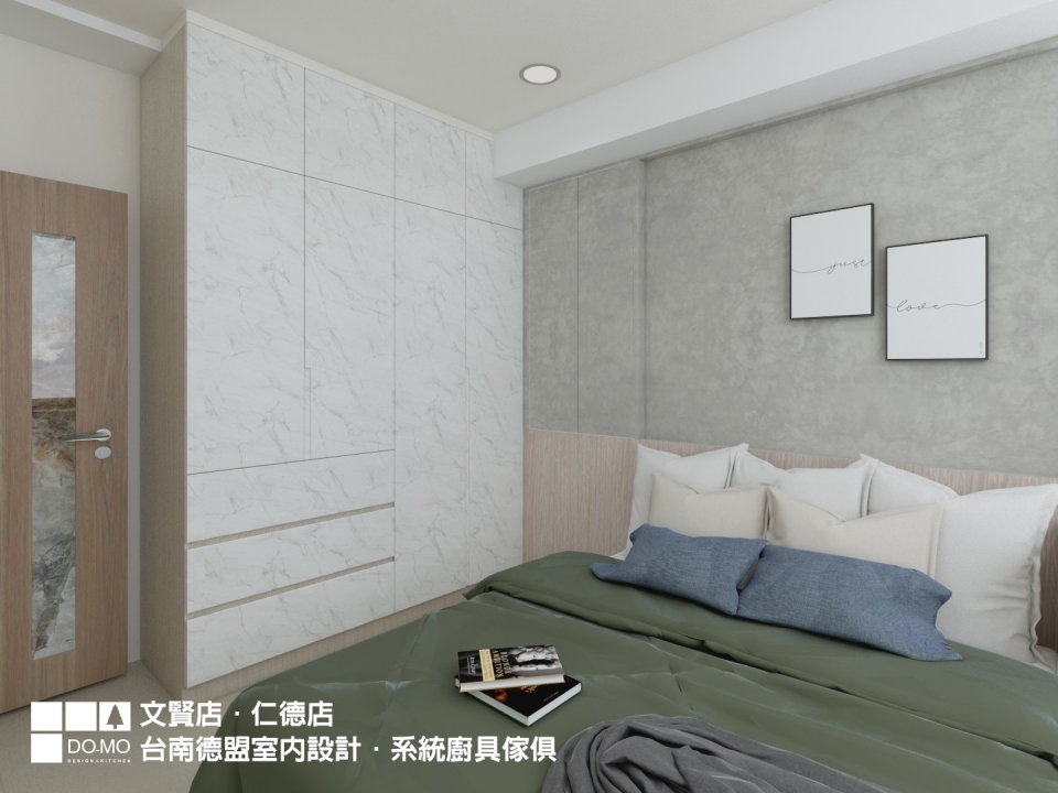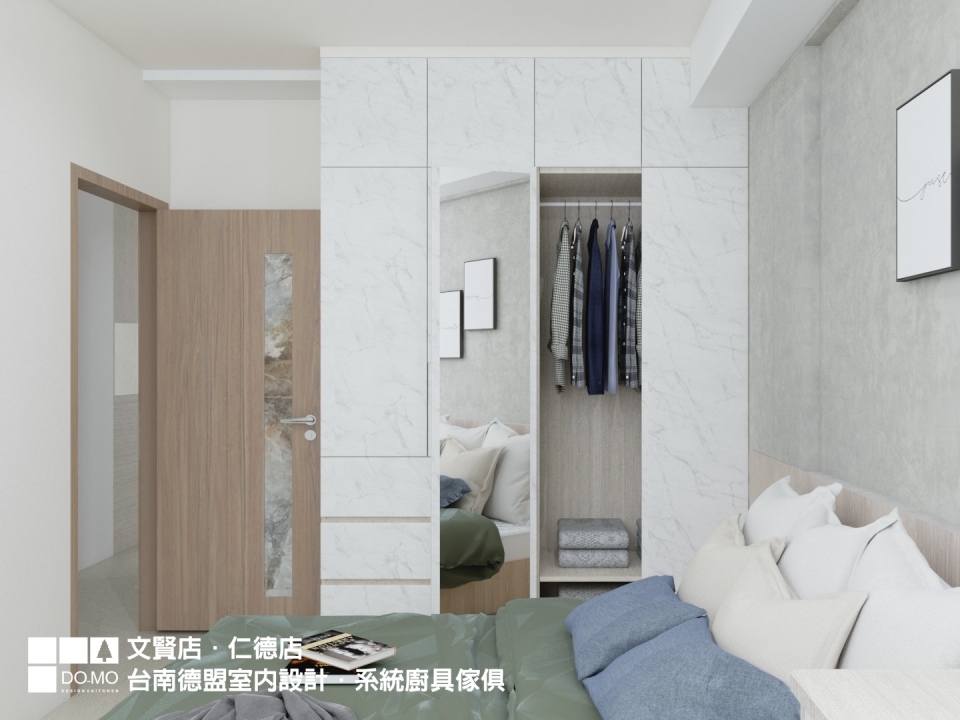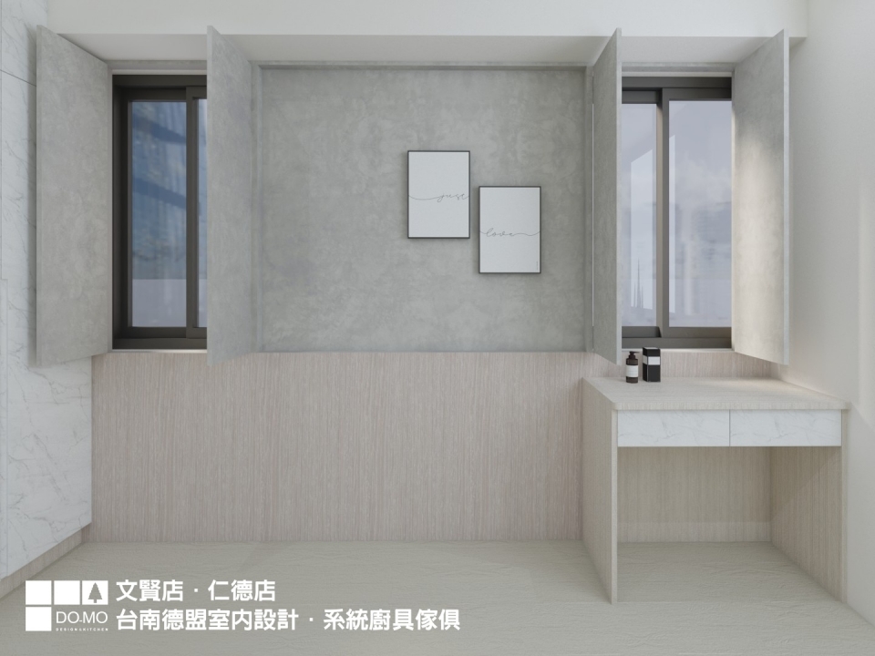 較為特別的是主臥室的部分,臥室格局較有限制,所以床頭與窗戶位於同一面牆。在不想裝設窗戶的情況下,用系統櫃設置一面裝飾牆,門片打開可引入陽光,閉合時則完全阻光,不僅美觀也減少落塵於床頭。