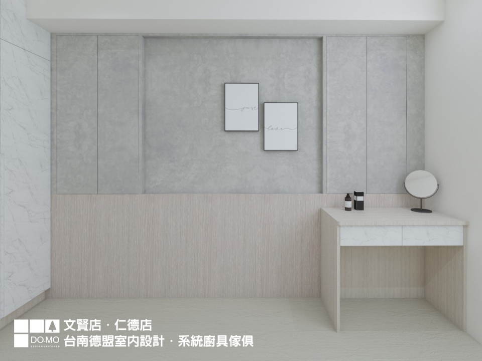 此案不論是公私領域,皆是用不同色階的灰色調及不同材質去層層堆疊出層次感,灰色的司曼特漆牆有質樸的自然質感、光滑面的白底灰石紋有著輕奢感、米色木紋則增添溫度,共同交織出優雅又溫馨的居家空間。