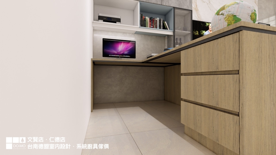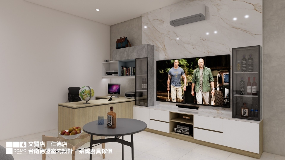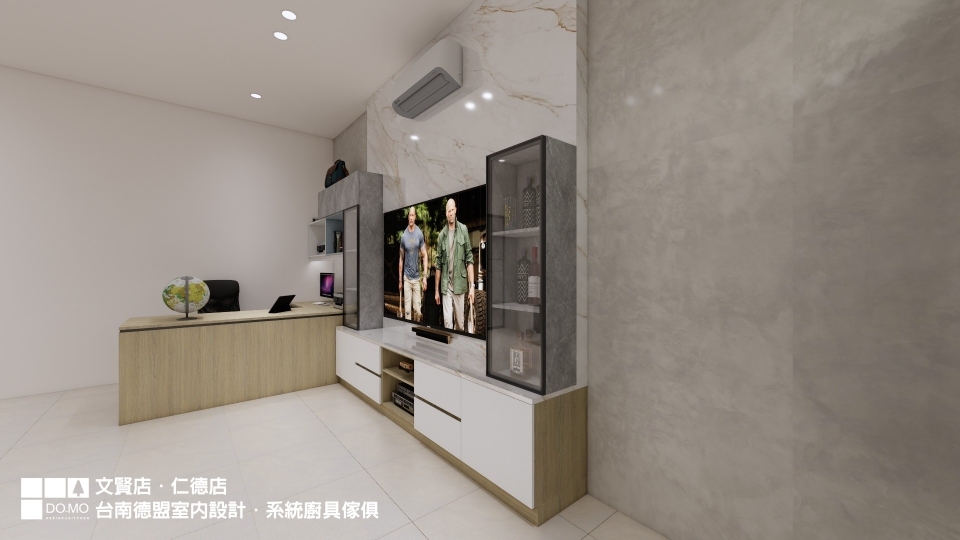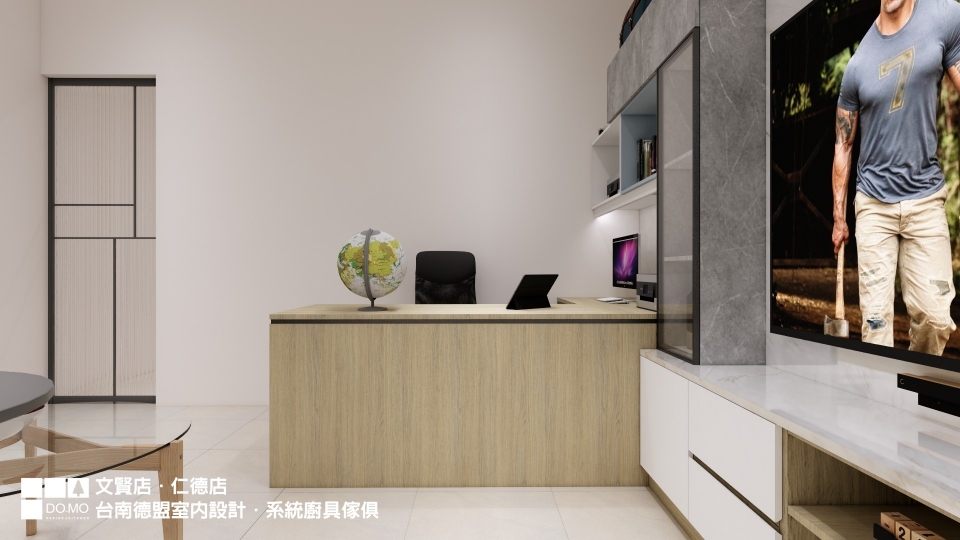書桌與電視牆形成L型,牆面皆是具有光澤感的可樂石薄板,前後兩層的設計為簡約的牆面增加層次。完全客製的書桌依據使用者習慣做規劃,合適的桌面尺寸、抽屜、書櫃格數……等,提供使用者舒適的使用空間。