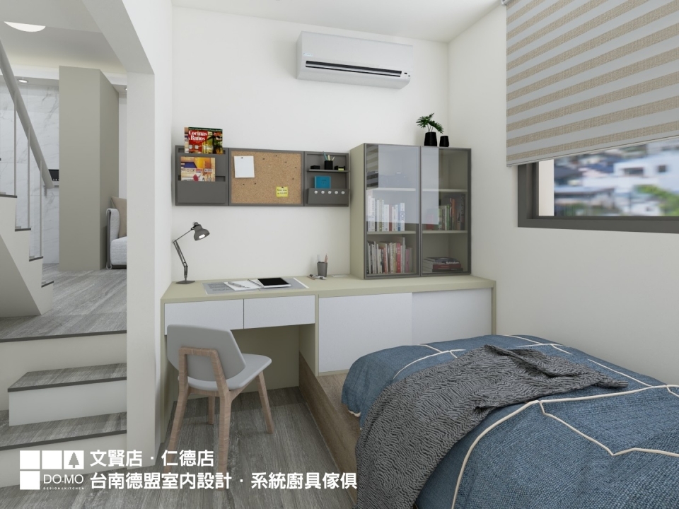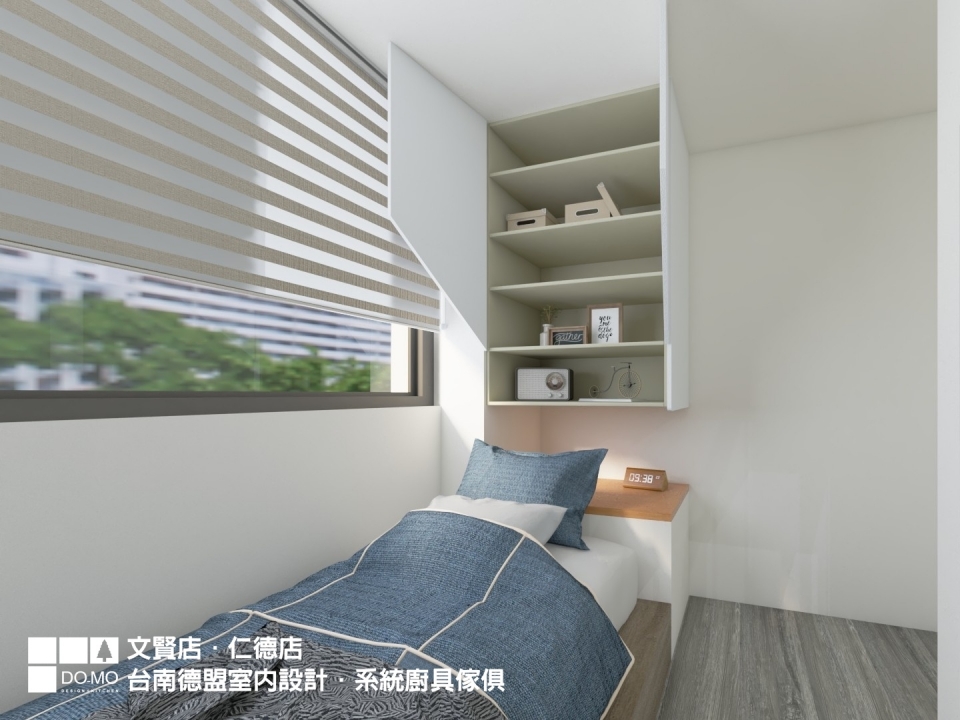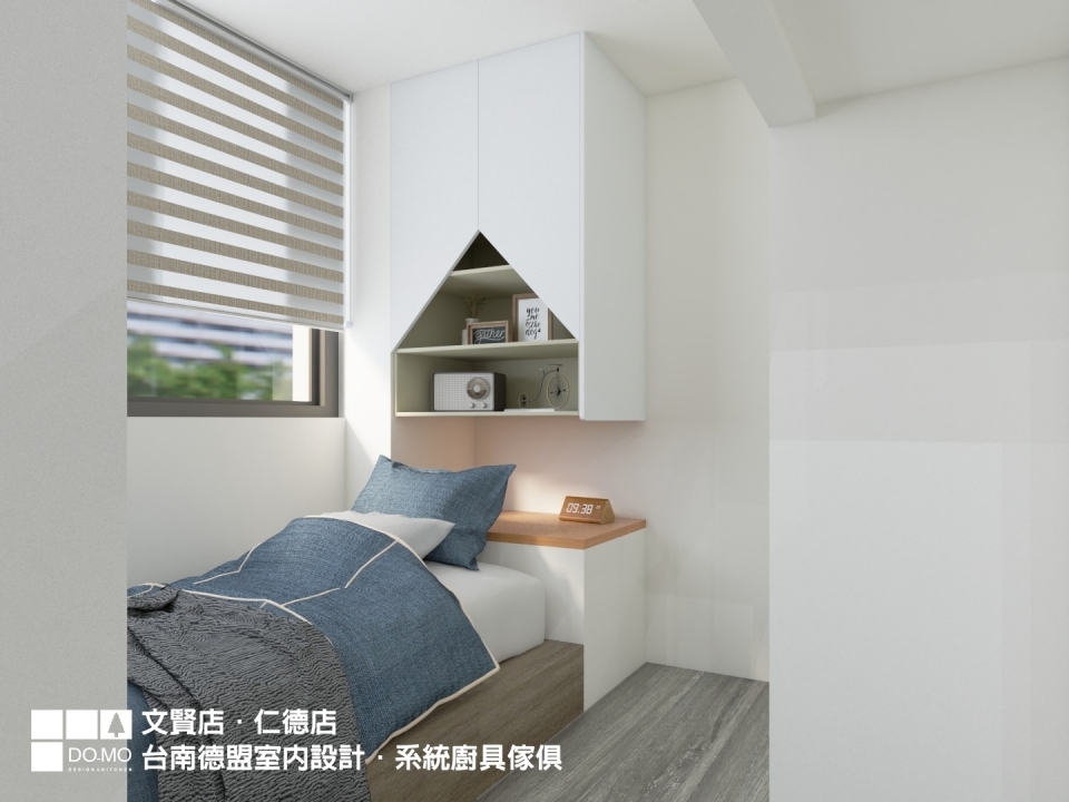 電視牆後方原本是餐廳,在使用頻率的考量後,改為孩子臥室使用,書桌、書櫃、衣櫃已足夠孩子所需。特別能注意的是衣櫃作為半開放式設計,降低在狹小空間中的壓迫感。