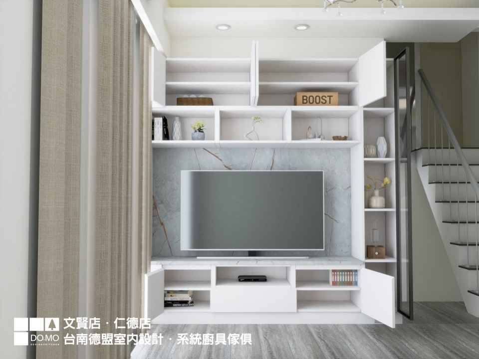 主要材料 ⏩ EGGER-日本F4星級塑合板、奧地利BLUM緩衝後鈕、木工、司曼特漆牆、格柵、可樂石薄板、金屬鐵件