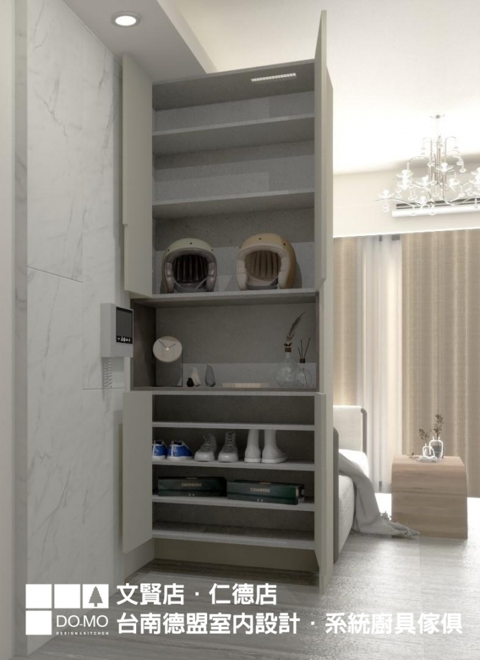 入門即見玄關鞋櫃,迴避了開門見底的風水問題;電視牆盡可能把面積都留給收納櫃,提升機能性。