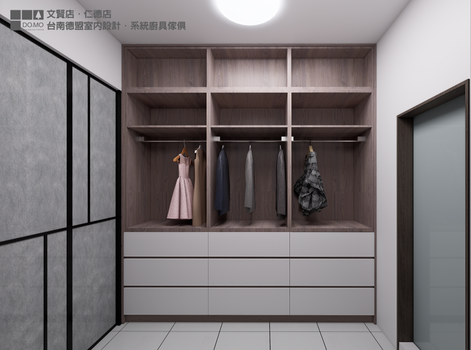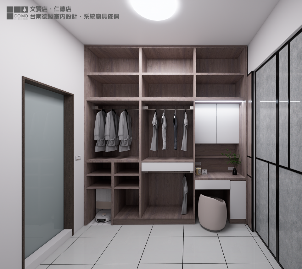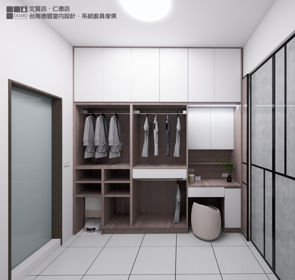 收納與更衣區則以溫潤木質為主軸,打造兼具機能與舒適感的私領域。開放式吊掛與層板配置,讓衣物分類清晰、取用便利;下方預留掃地機器人空間,細節中展現對生活的體貼。寬闊的整合式桌面與收納櫃,提供業主育兒更彈性的使用。