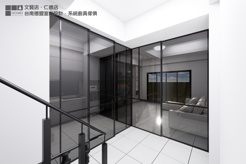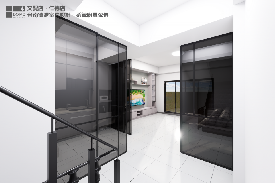 公共區域以鐵件玻璃拉門作為場域界定,黑框線條勾勒出俐落結構,同時保有視線穿透性,使客廳與餐廚空間在分與合之間取得平衡。光線得以自由流動,讓整體空間維持明亮開闊,也為生活增添一份輕盈節奏。